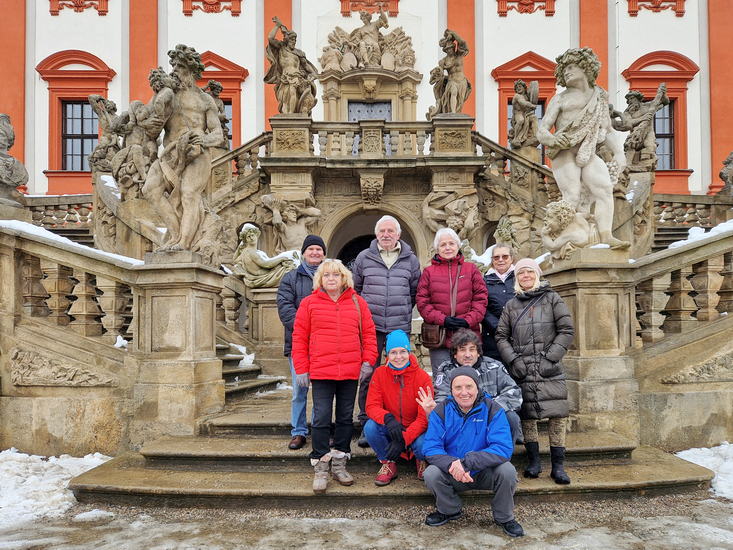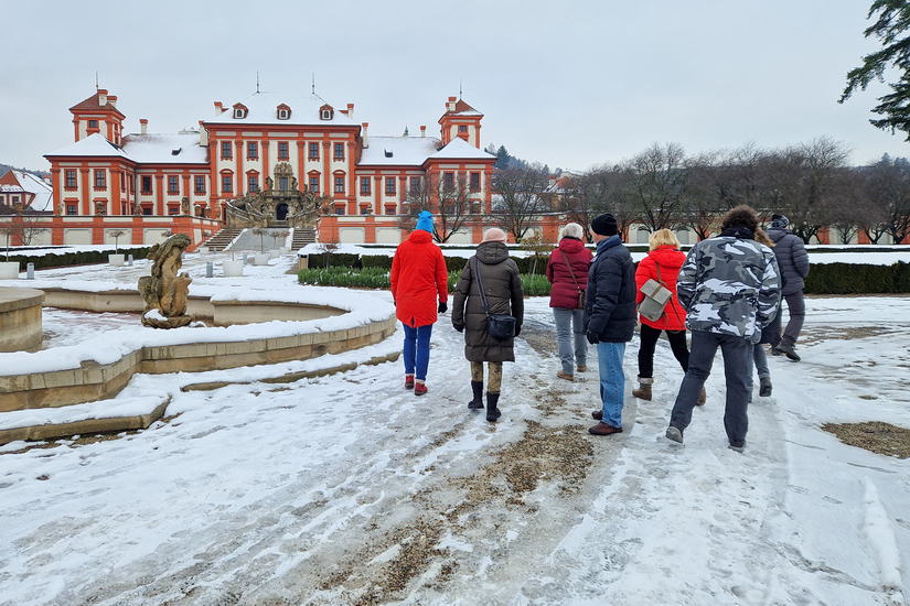 Před zamčenou bránou nás Helena seznámila s historií objektu – po vzoru honosných předměstských římských vil si zde ve druhé polovině 17. století vybudoval hrabě Václav Vojtěch ze Šternberka své letní sídlo. V průběhu staletí tato krásná barokní stavba (architekt Jean-Baptiste Mathey) měnila majitele. Poslední z nich, velkostatkář Alois Svoboda, věnoval v roce 1922 zámek i obrovské pozemky kolem československému státu. Část pozemků připadla zoologické i botanické zahradě. V současné době spravuje zámek Galerie hl. m. Prahy.