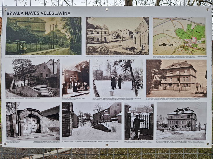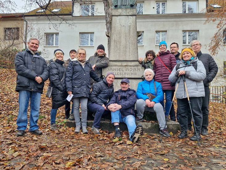 Opustili jsme katastr Liboce a vstoupili na výsostné území starobylé obce Veleslavín. O jejím založení v 10. století, střídání majitelů a zajímavostech ze současnosti (stejně jako o všech pamětihodnostech, které jsme cestou míjeli) nám povyprávěla Helenka. Před pomníkem zdejšího rodáka, Mistra pražské univerzity, velkého humanisty, spisovatele a v neposlední řadě i knihtiskaře Daniela Adama z Veleslavína jsme učinili skupinové foto. U nedalekého vodovodního domku, renesanční technické památky z r. 1555, jsme byli poučeni o systému Královského hradního vodovodu – zdrojů jímání vody, rozvodu jedlovými trubkami i způsobech čištění.