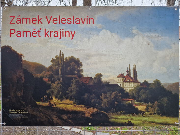 Přes malou enklávu citlivě opravených starých domků se zvoničkou jsme doputovali ke zlatému hřebu dnešní výpravy – veleslavínskému zámečku. Historie, současnost i vize budoucnosti tohoto areálu by vydalo na hodně velkou kapitolu, proto doporučuji případným zájemcům strejdu Googla – viz odkaz na konci. My jsme zámek obešli, opatrně našlapovali u dalších značně zchátralých budov v parku, prošli tisovou alejkou k fontáně za zámkem. V přízemí zámku probíhaly jakési dětské workshopy, takže budova alespoň trochu funguje. Na nádvoří jsme si prohlédli výstavu velkoformátových fotografií z historie objektu i celého Veleslavína a vydali se vzhůru k Petřinám.