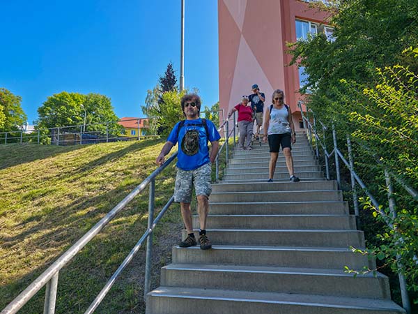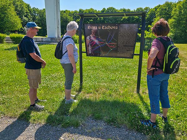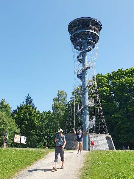 Ta nás vedla lesem pořád do kopce kolem bývalého Paulánského kláštera a nedostavěného zámku maršála Windischgrätze až ke krásné štíhlé ocelové rozhledně Vysoká. A že opravdu byla vysoká – 25 metrů! Po čase stráveném obdivováním okolní krajiny či odpočinkem jsme se kolem betonového památníku bitvy u Tachova, kde v roce 1427 husité drtivě porazili křižácká vojska, opět spustili do údolí Mže a vyškrábali Tachovem zpět do ubytování.