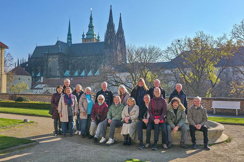 Sešli jsme se v 10:00 v opravdu hojném počtu 17 lidí u vstupu do Jízdárny Pražského hradu, kde Linda se Zdeňkem naplánovali návštěvu výstavy s lákavým názvem Vltava slavná & splavná. Ta byla uspořádána v roce 2025, protože právě letos uplynulo 150 let od prvního uvedení slavné symfonické básně Vltava Bedřicha Smetany. Snad to ovlivnilo právě to téma výstavy nebo krásné podzimní počasí, že se nás sešlo tolik.