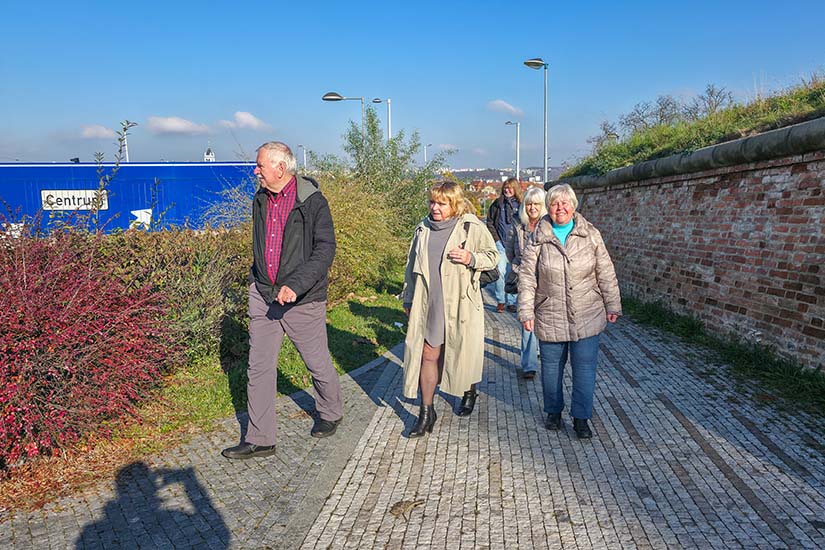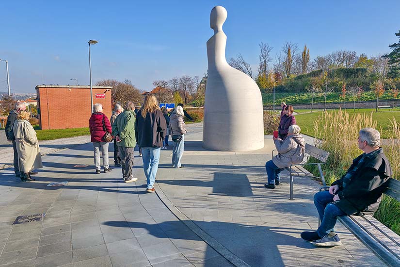 Než jsme překročili rušnou komunikaci, zastavili jsme se u pomníku Marie Terezie od sochaře Jana Kováříka a architekta Jana Proksy z roku 2020. Na výstavě jsme se dozvěděli, že panovnice měla ve velké oblibě perly a doporučovala je nosit svým dcerám pro zvýšení plodnosti. Pět a půl metru vysoká socha z umělého kamene, které se někdy přezdívá “šachová figurka”, svým stylizovaným vzhledem vyvolává obdivné i kritické názory. Ale to je asi v pořádku, protože nejhorší ze všeho je lhostejnost ke svému okolí.