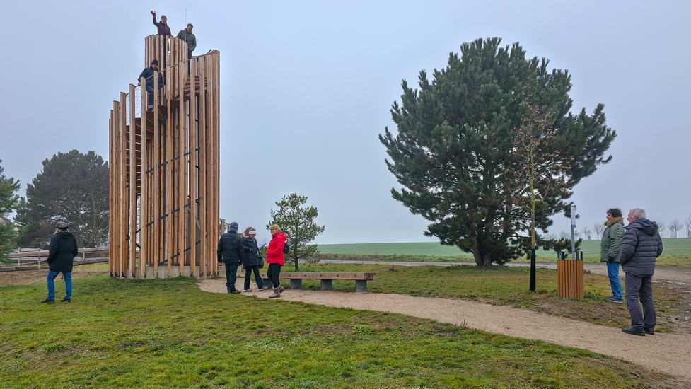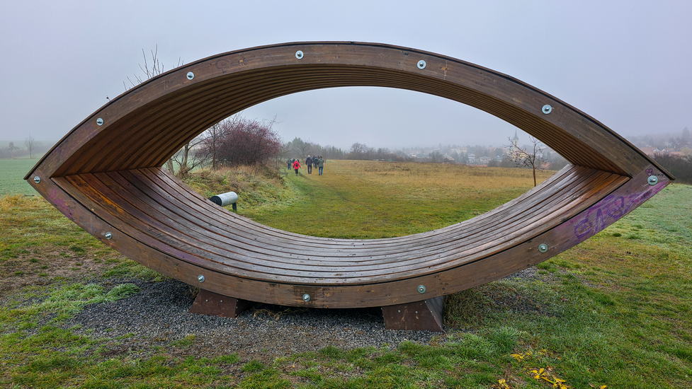 Hned první shlédnutou atrakcí bylo Nebušické oko (fotorám, pozorovatelna a údajně i houpačka), které pro potěchu kolemjdoucích vymysleli a zrealizovali v r. 2022 studenti ČVUT. Rozhoupat Oko ani skrz něj fotit daleké výhledy se nám nepodařilo, ale posloužilo k neotřelému skupinovému fotu.
