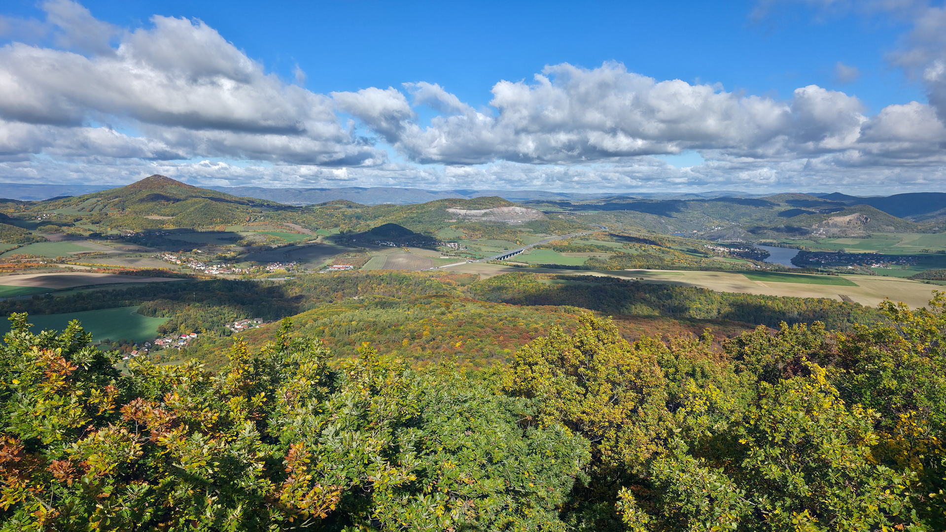 Dálnice D8 protínající České středohoří z vrcholu Lovoše